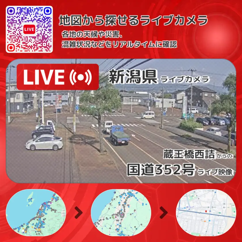 国道352号(蔵王橋通り)の他に、新潟県道473号槇下南中線や周辺の気象状況も併せてチェックすることが可能で、台風・大雨・地震などの災害による被害状況も把握することができます。