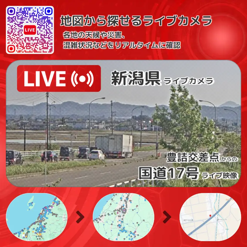 国道17号(長岡東バイパス)の他に、豊詰交差点や周辺の気象状況も併せてチェックすることが可能で、台風・大雨・地震などの災害による被害状況も把握することができます。