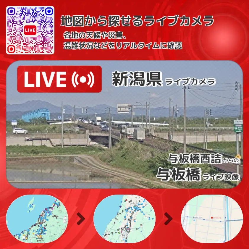 与板橋の他に、新潟県道378号大口与板線や周辺の気象状況も併せてチェックすることが可能で、台風・大雨・地震などの災害による被害状況も把握することができます。