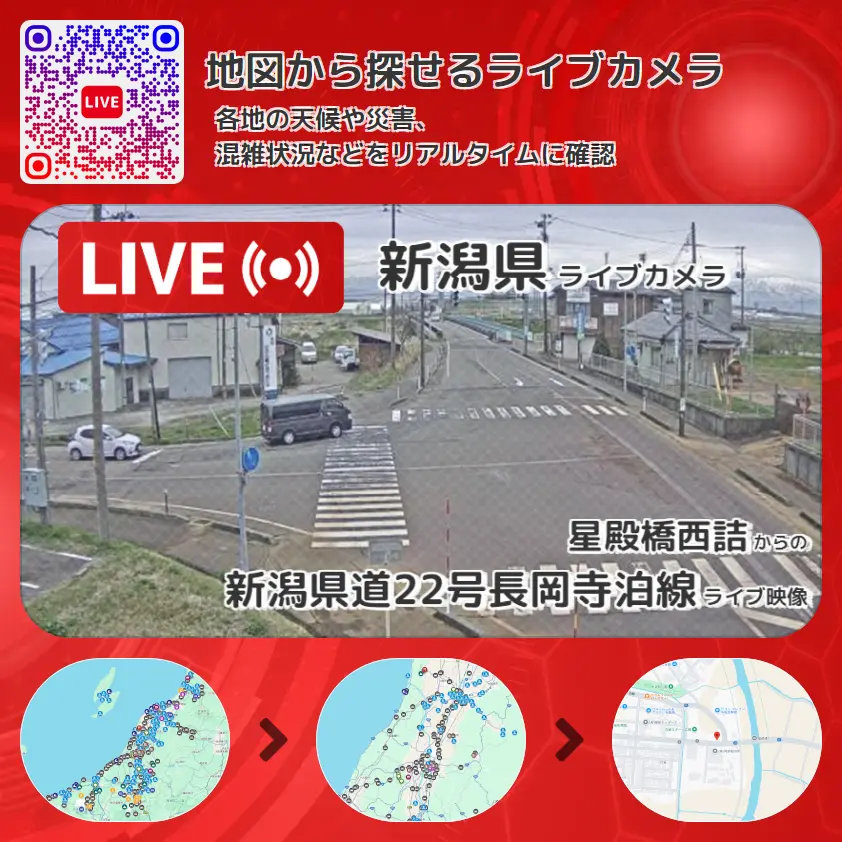 新潟県道22号長岡寺泊線の他に、星殿橋西詰交差点や周辺の気象状況も併せてチェックすることが可能で、台風・大雨・地震などの災害による被害状況も把握することができます。