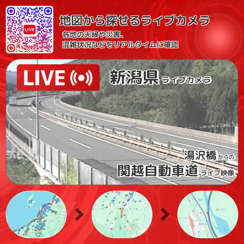 関越自動車道(関越道)の他に、湯沢インターチェンジ(湯沢IC)~塩沢石打インターチェンジ(塩沢石打IC)や周辺の気象状況も併せてチェックすることが可能で、台風・大雨・地震などの災害による被害状況も把握することができます。