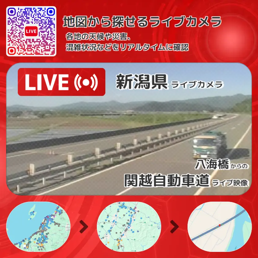 関越自動車道(関越道)の他に、六日町インターチェンジ(六日町IC)~小出インターチェンジ(小出IC)や周辺の気象状況も併せてチェックすることが可能で、台風・大雨・地震などの災害による被害状況も把握することができます。