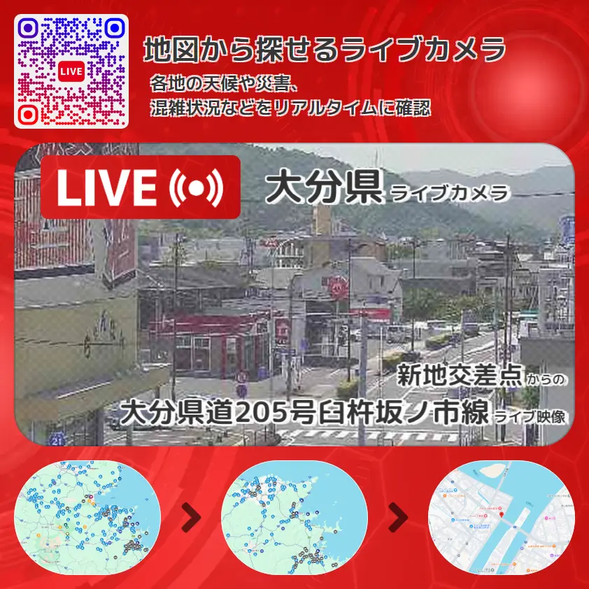新地交差点から、大分県道205号臼杵坂ノ市線が確認できるライブカメラです。