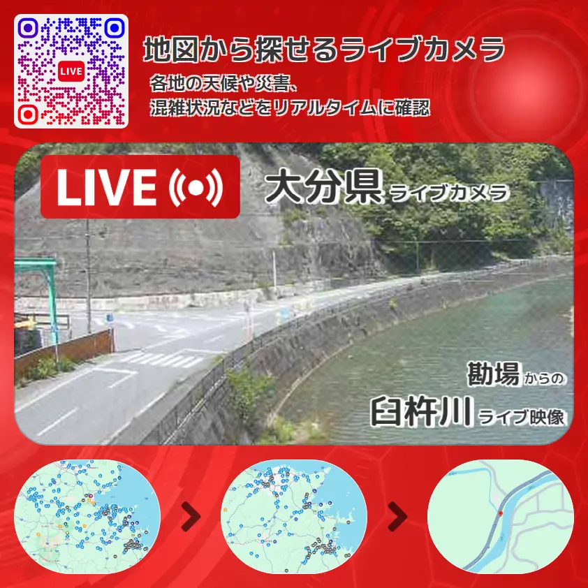 臼杵川の他に、勘場川や周辺の気象状況も併せてチェックすることが可能で、台風・大雨・地震などの災害による被害状況も把握することができます。