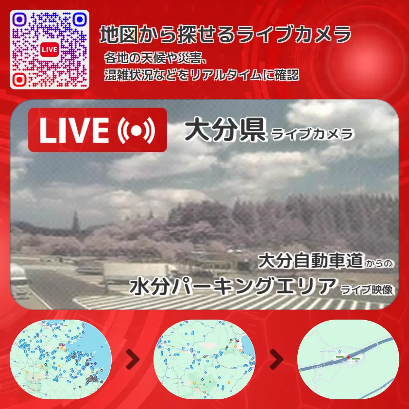周辺の気象状況も併せてチェックすることが可能で、台風・大雨・地震などの災害による被害状況も把握することができます。
