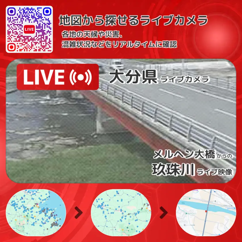 玖珠川の他に、メルヘン大橋や周辺の気象状況も併せてチェックすることが可能で、台風・大雨・地震などの災害による被害状況も把握することができます。