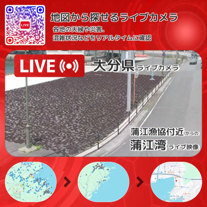 蒲江湾の他に、国道388号や周辺の気象状況も併せてチェックすることが可能で、台風・大雨・地震などの災害による被害状況も把握することができます。