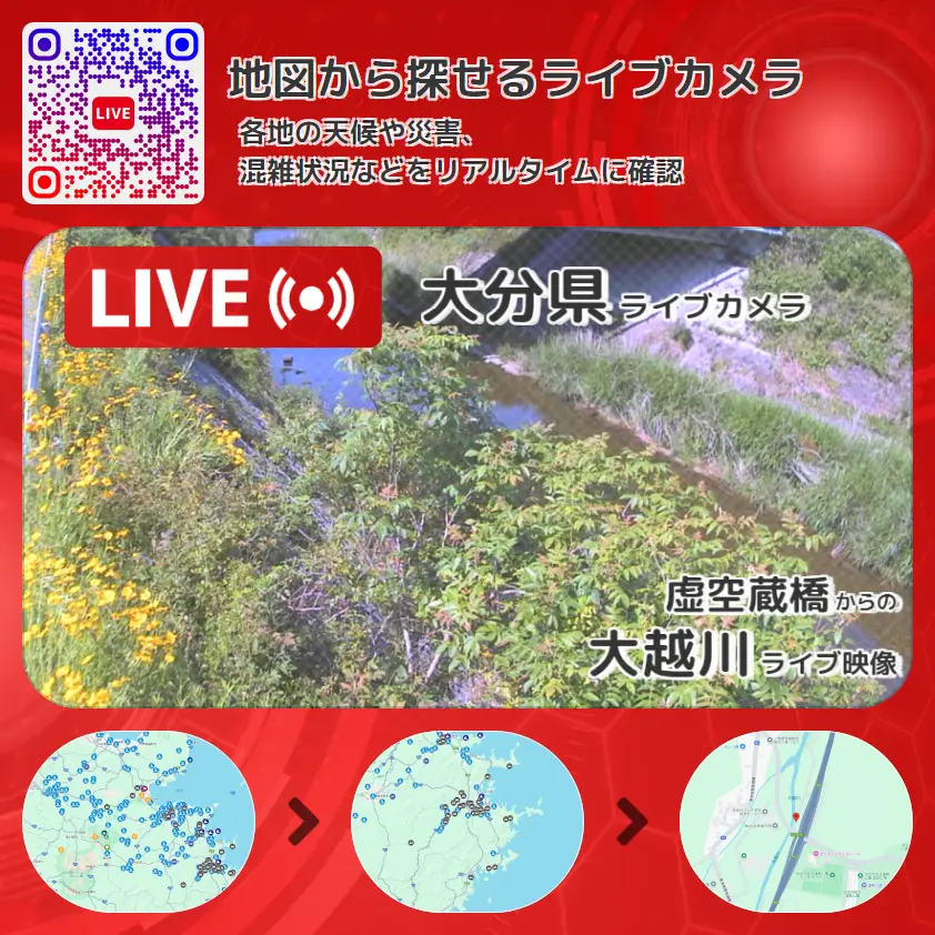 大越川の他に、大越川泥谷口川合流地点付近や周辺の気象状況も併せてチェックすることが可能で、台風・大雨・地震などの災害による被害状況も把握することができます。