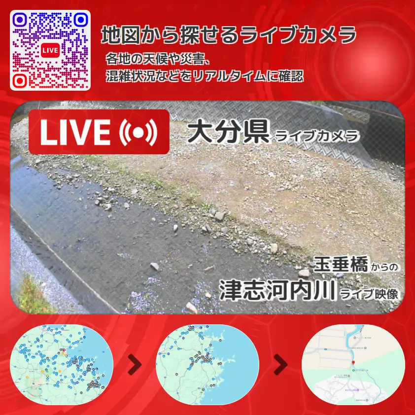 津志河内川(旧堅田川)の他に、玉垂橋や周辺の気象状況も併せてチェックすることが可能で、台風・大雨・地震などの災害による被害状況も把握することができます。