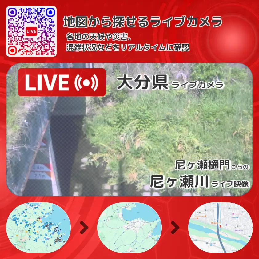 尼ヶ瀬川の他に、尼ヶ瀬川大分川合流地点付近や周辺の気象状況も併せてチェックすることが可能で、台風・大雨・地震などの災害による被害状況も把握することができます。