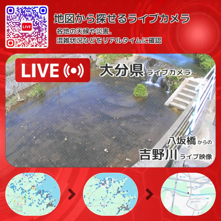 吉野川の他に、八坂橋や周辺の気象状況も併せてチェックすることが可能で、台風・大雨・地震などの災害による被害状況も把握することができます。