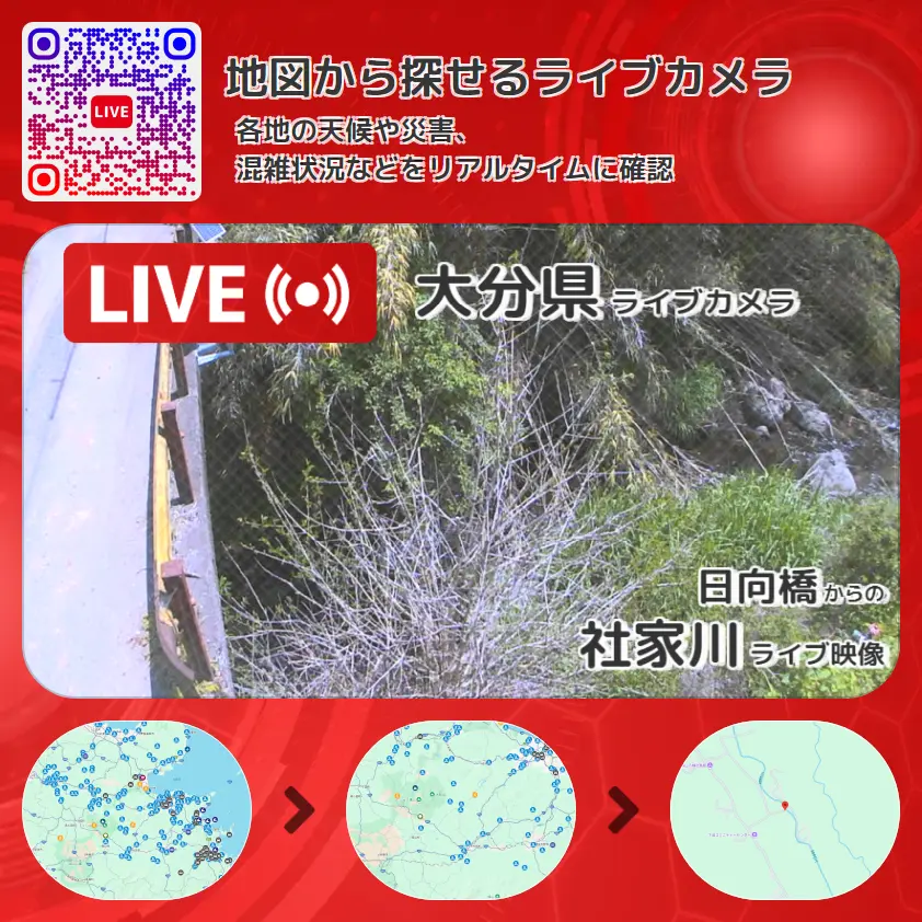 社家川の他に、日向橋や周辺の気象状況も併せてチェックすることが可能で、台風・大雨・地震などの災害による被害状況も把握することができます。