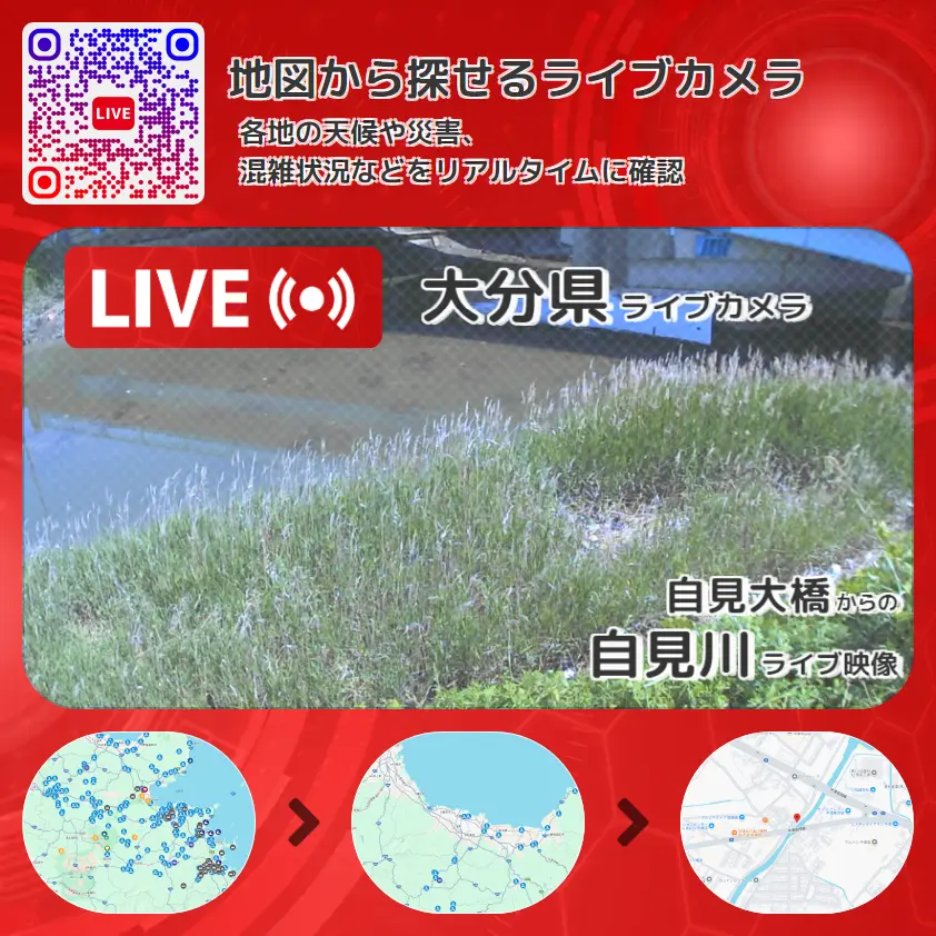 自見川の他に、自見大橋や周辺の気象状況も併せてチェックすることが可能で、台風・大雨・地震などの災害による被害状況も把握することができます。