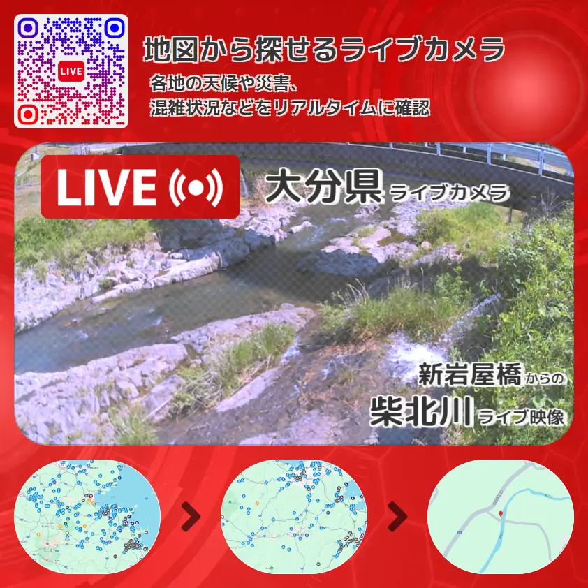柴北川の他に、新岩屋橋や周辺の気象状況も併せてチェックすることが可能で、台風・大雨・地震などの災害による被害状況も把握することができます。