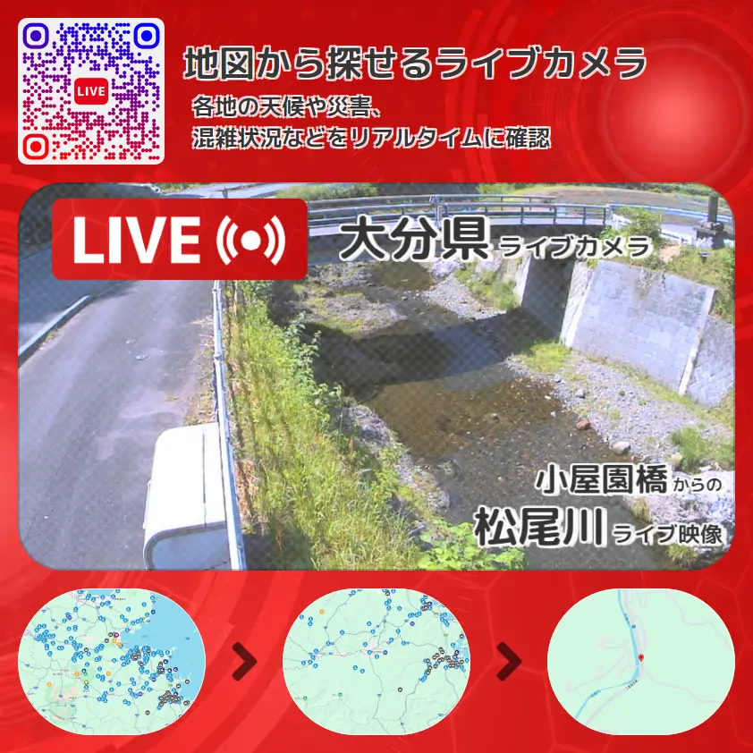 松尾川の他に、小屋園橋や周辺の気象状況も併せてチェックすることが可能で、台風・大雨・地震などの災害による被害状況も把握することができます。