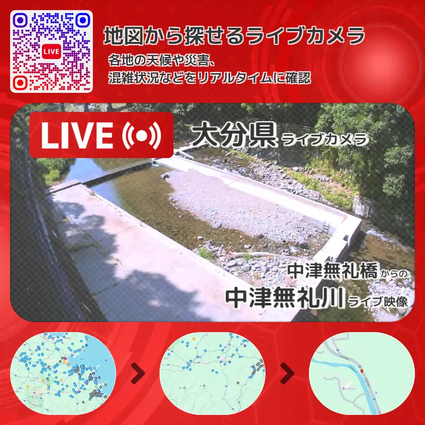 中津無礼川の他に、中津無礼橋や周辺の気象状況も併せてチェックすることが可能で、台風・大雨・地震などの災害による被害状況も把握することができます。