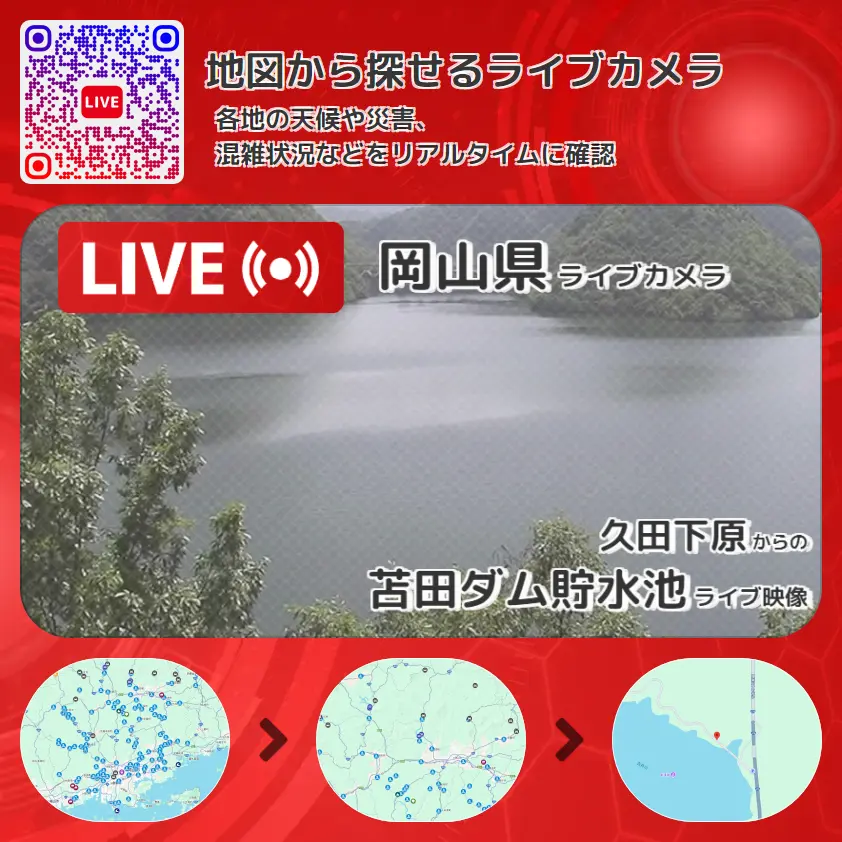 苫田ダム貯水池の他に、奥津湖や周辺の気象状況も併せてチェックすることが可能で、台風・大雨・地震などの災害による被害状況も把握することができます。