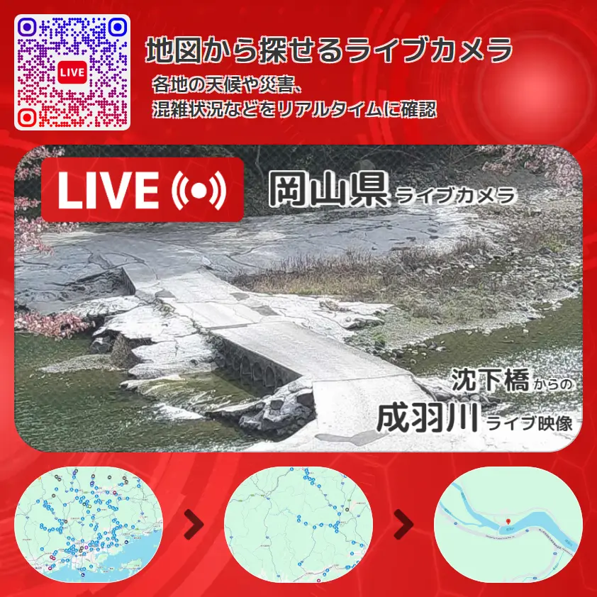 成羽川の他に、沈下橋や周辺の気象状況も併せてチェックすることが可能で、台風・大雨・地震などの災害による被害状況も把握することができます。