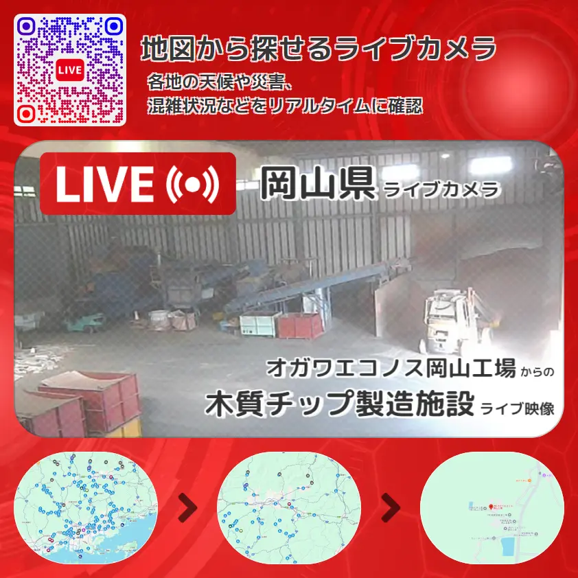 オガワエコノス岡山工場から、木質チップ製造施設が確認できるライブカメラです。