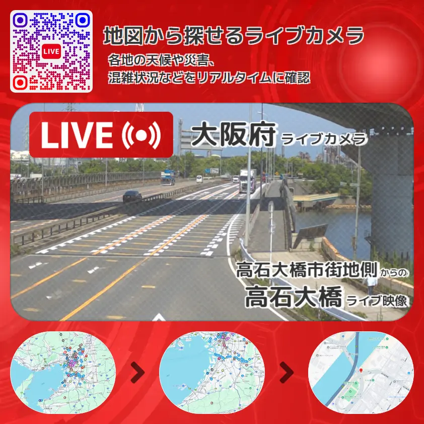 高石大橋の他に、大阪府道29号大阪臨海線や周辺の気象状況も併せてチェックすることが可能で、台風・大雨・地震などの災害による被害状況も把握することができます。