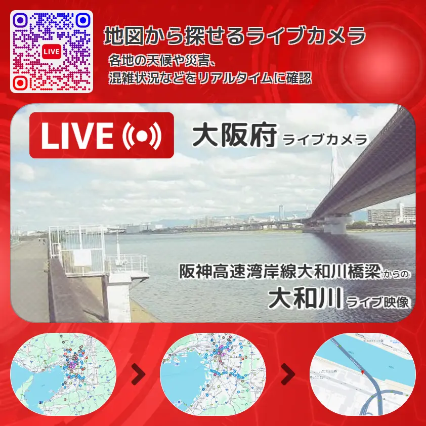 大和川の他に、阪神高速湾岸線(阪神高速4号湾岸線)大和川橋梁や周辺の気象状況も併せてチェックすることが可能で、台風・大雨・地震などの災害による被害状況も把握することができます。