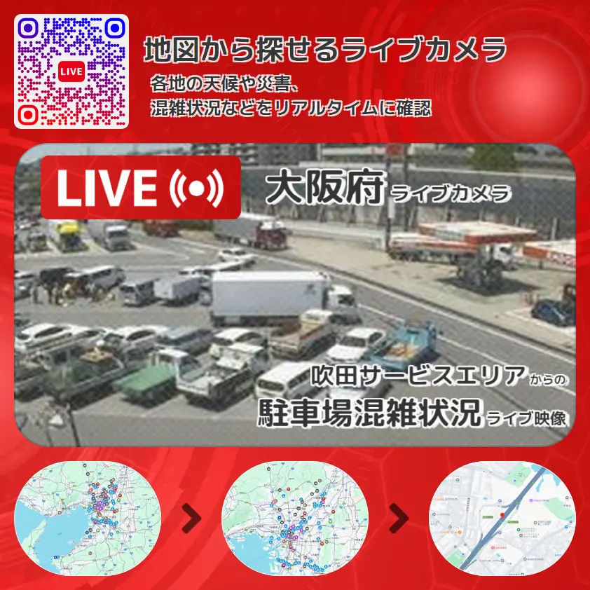 吹田サービスエリア(吹田SA)から、駐車場混雑状況が確認できるライブカメラです。