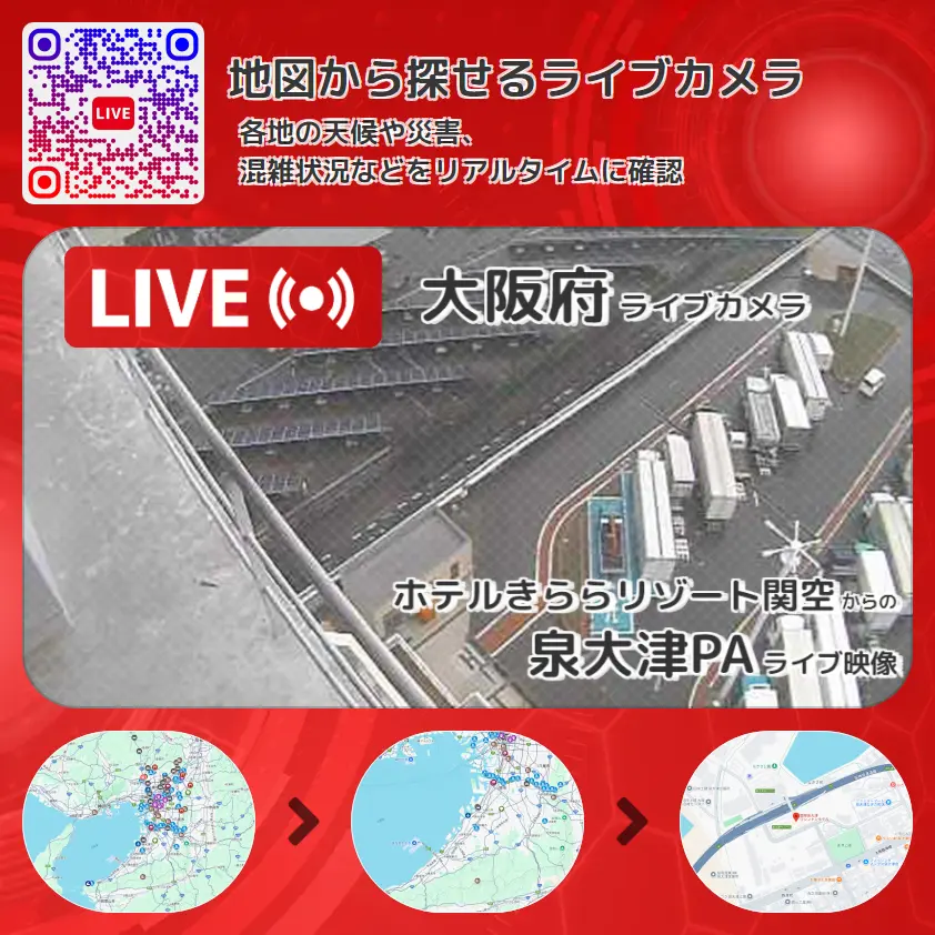 泉大津PA(下り)の他に、ハヤブサ子育て見守り(ヒナ)や周辺の気象状況も併せてチェックすることが可能で、台風・大雨・地震などの災害による被害状況も把握することができます。
