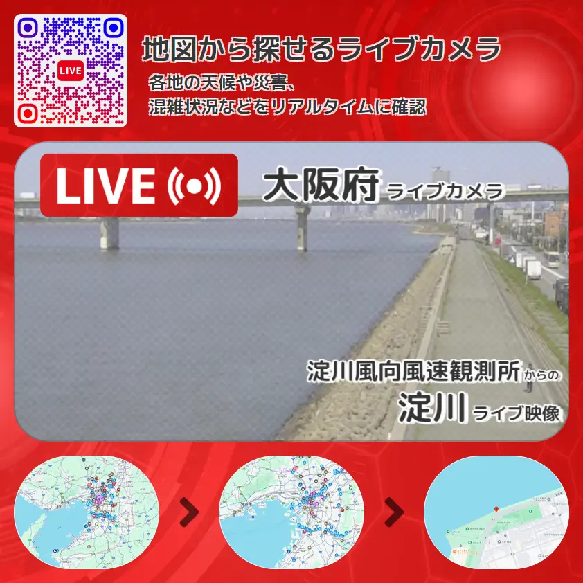 淀川の他に、此花通や周辺の気象状況も併せてチェックすることが可能で、台風・大雨・地震などの災害による被害状況も把握することができます。