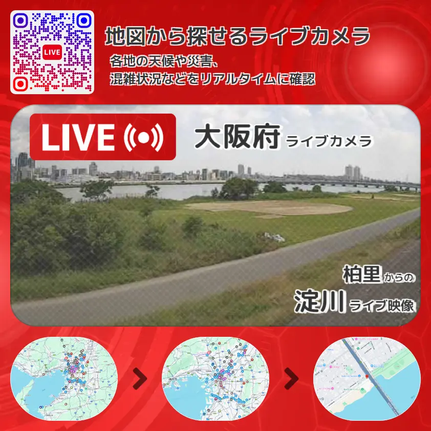 淀川の他に、柏里河川敷グラウンドや周辺の気象状況も併せてチェックすることが可能で、台風・大雨・地震などの災害による被害状況も把握することができます。