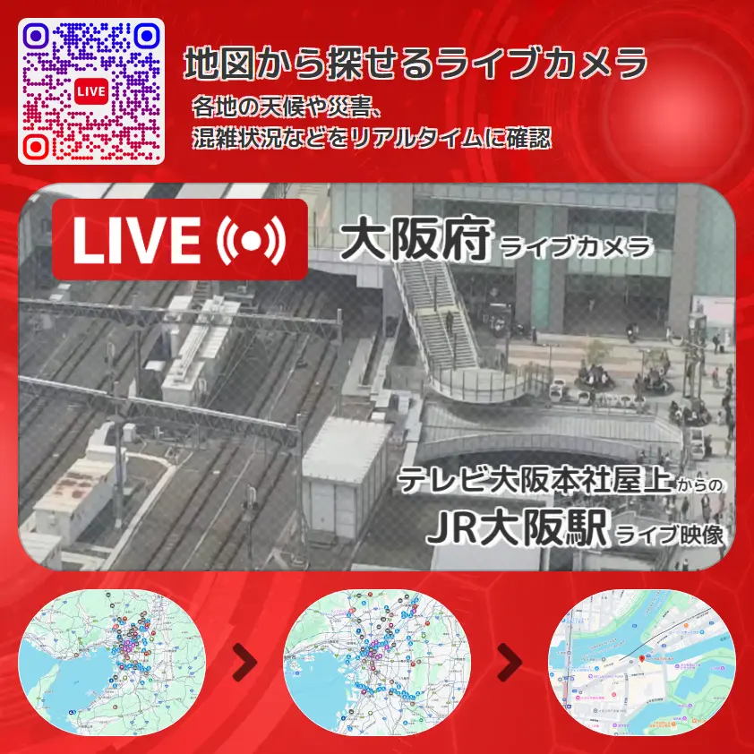 JR大阪駅の他に、大阪市内上空天気や周辺の気象状況も併せてチェックすることが可能で、台風・大雨・地震などの災害による被害状況も把握することができます。