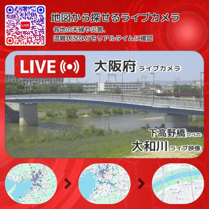 大和川の他に、下高野橋や周辺の気象状況も併せてチェックすることが可能で、台風・大雨・地震などの災害による被害状況も把握することができます。