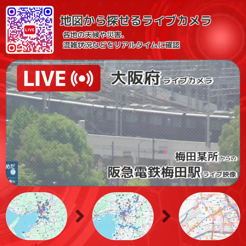阪急電鉄梅田駅の他に、大阪梅田地区や周辺の気象状況も併せてチェックすることが可能で、台風・大雨・地震などの災害による被害状況も把握することができます。