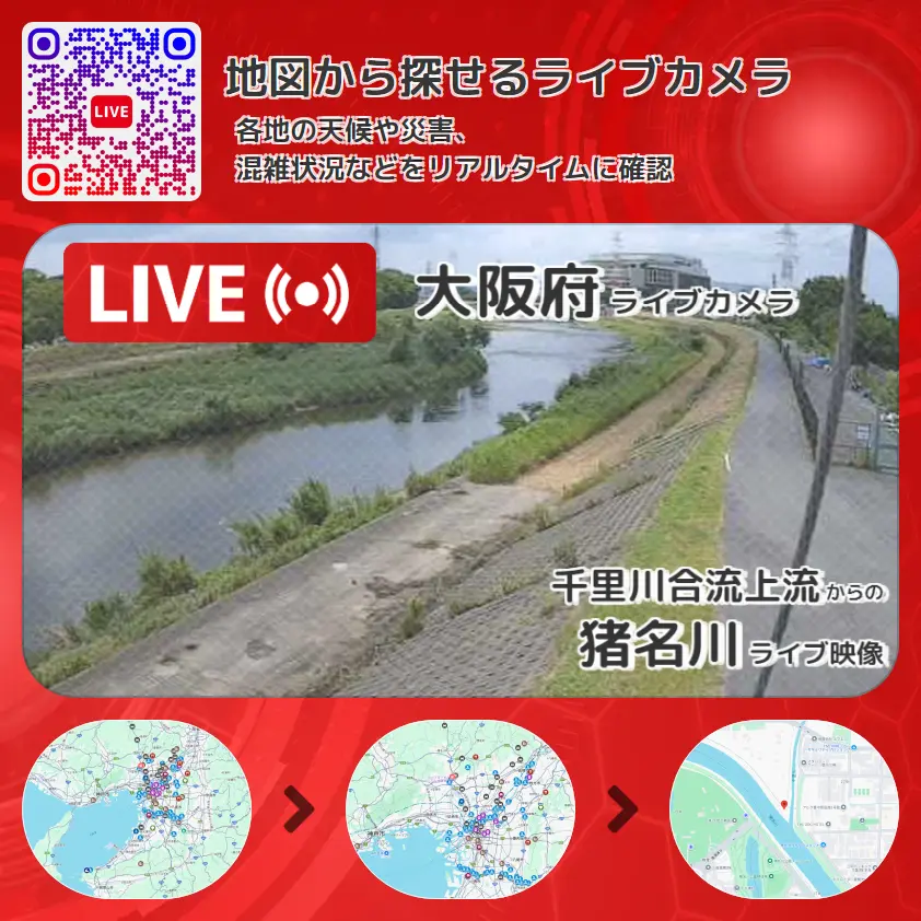 猪名川の他に、猪名川千里川合流地点付近や周辺の気象状況も併せてチェックすることが可能で、台風・大雨・地震などの災害による被害状況も把握することができます。