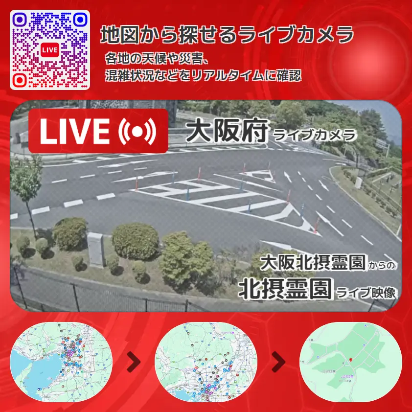 北摂霊園の他に、阪急バス北摂霊園モニュメント前バス停留所や周辺の気象状況も併せてチェックすることが可能で、台風・大雨・地震などの災害による被害状況も把握することができます。