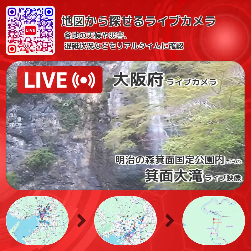 明治の森箕面国定公園内から、箕面大滝(箕面滝)が確認できるライブカメラです。