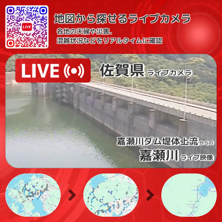 嘉瀬川の他に、嘉瀬川ダムや周辺の気象状況も併せてチェックすることが可能で、台風・大雨・地震などの災害による被害状況も把握することができます。