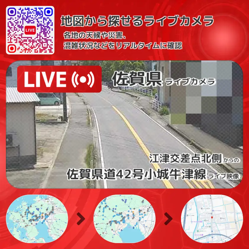 佐賀県道42号小城牛津線の他に、江津交差点方面や周辺の気象状況も併せてチェックすることが可能で、台風・大雨・地震などの災害による被害状況も把握することができます。
