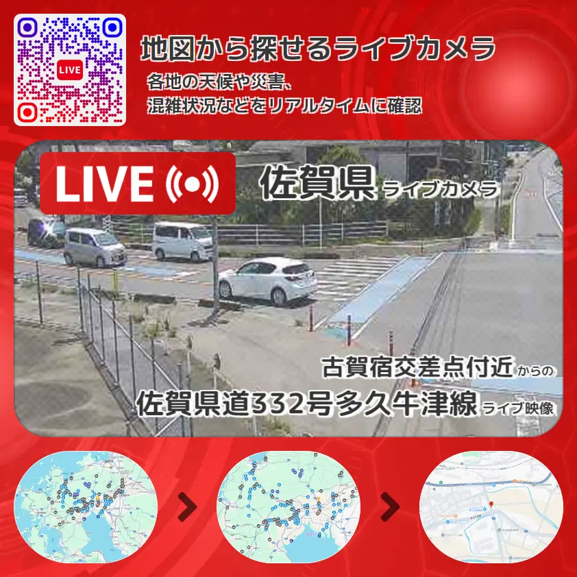 佐賀県道332号多久牛津線の他に、佐賀県道284号別府牛津停車場線や周辺の気象状況も併せてチェックすることが可能で、台風・大雨・地震などの災害による被害状況も把握することができます。
