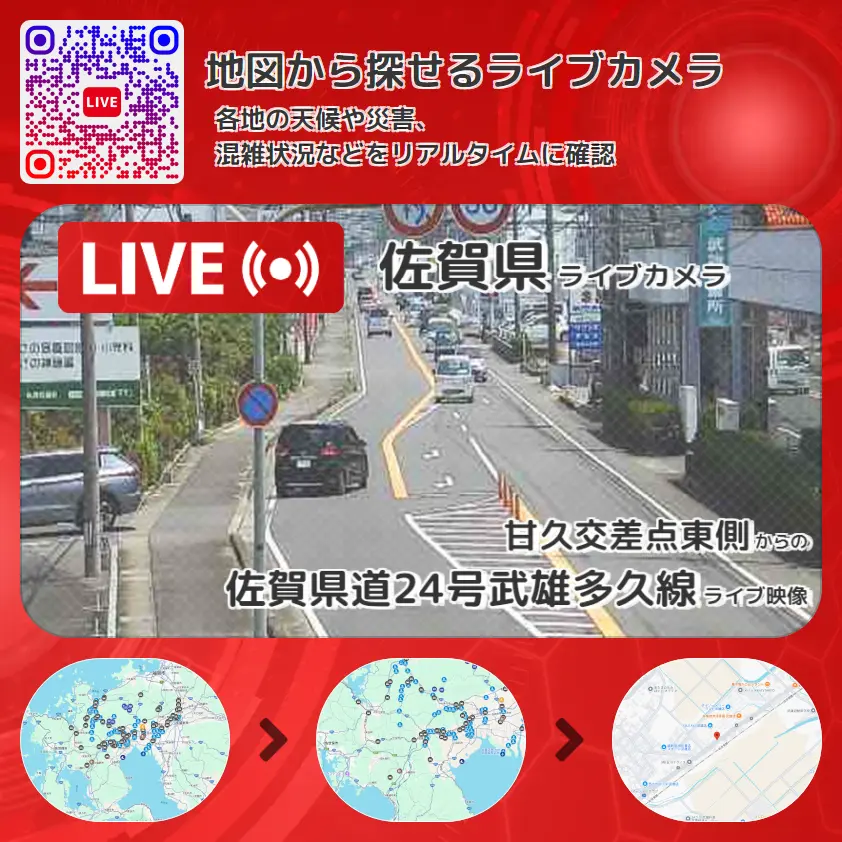 佐賀県道24号武雄多久線の他に、高橋駅(JR佐世保線)方面や周辺の気象状況も併せてチェックすることが可能で、台風・大雨・地震などの災害による被害状況も把握することができます。