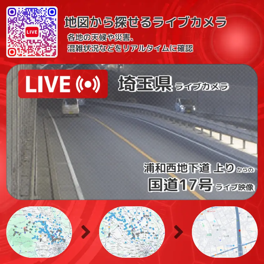 国道17号(新大宮バイパス)の他に、浦和西地下道上りや周辺の気象状況も併せてチェックすることが可能で、台風・大雨・地震などの災害による被害状況も把握することができます。