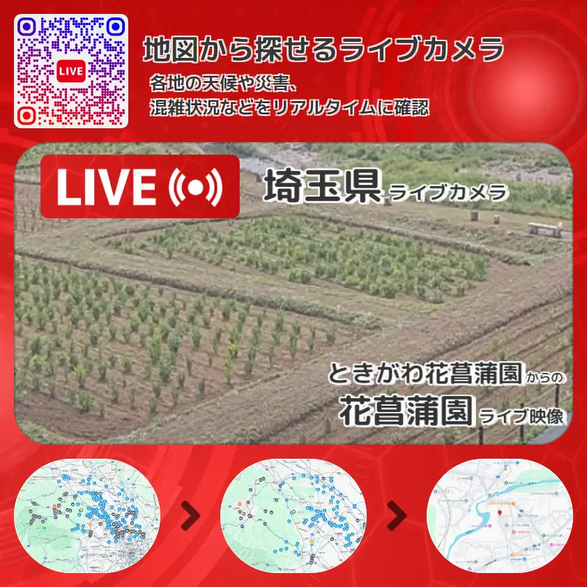花菖蒲園の他に、花菖蒲まつりや周辺の気象状況も併せてチェックすることが可能で、台風・大雨・地震などの災害による被害状況も把握することができます。