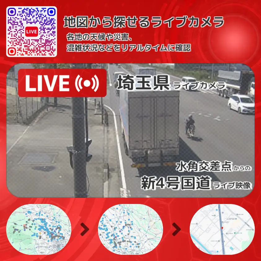新4号国道(越谷春日部バイパス)の他に、中川方面や周辺の気象状況も併せてチェックすることが可能で、台風・大雨・地震などの災害による被害状況も把握することができます。