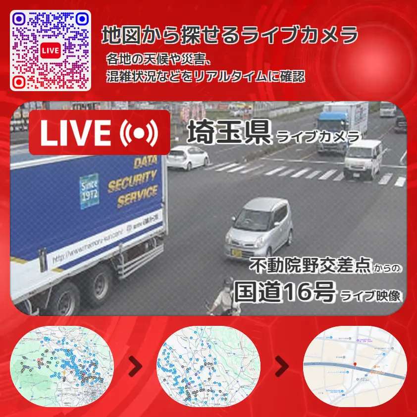 国道16号(東京環状道路)の他に、不動院野交差点や周辺の気象状況も併せてチェックすることが可能で、台風・大雨・地震などの災害による被害状況も把握することができます。