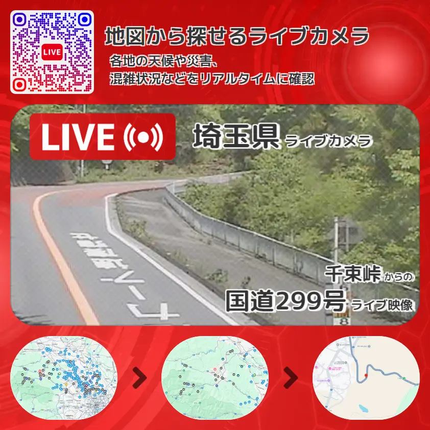 国道299号の他に、千束峠や周辺の気象状況も併せてチェックすることが可能で、台風・大雨・地震などの災害による被害状況も把握することができます。