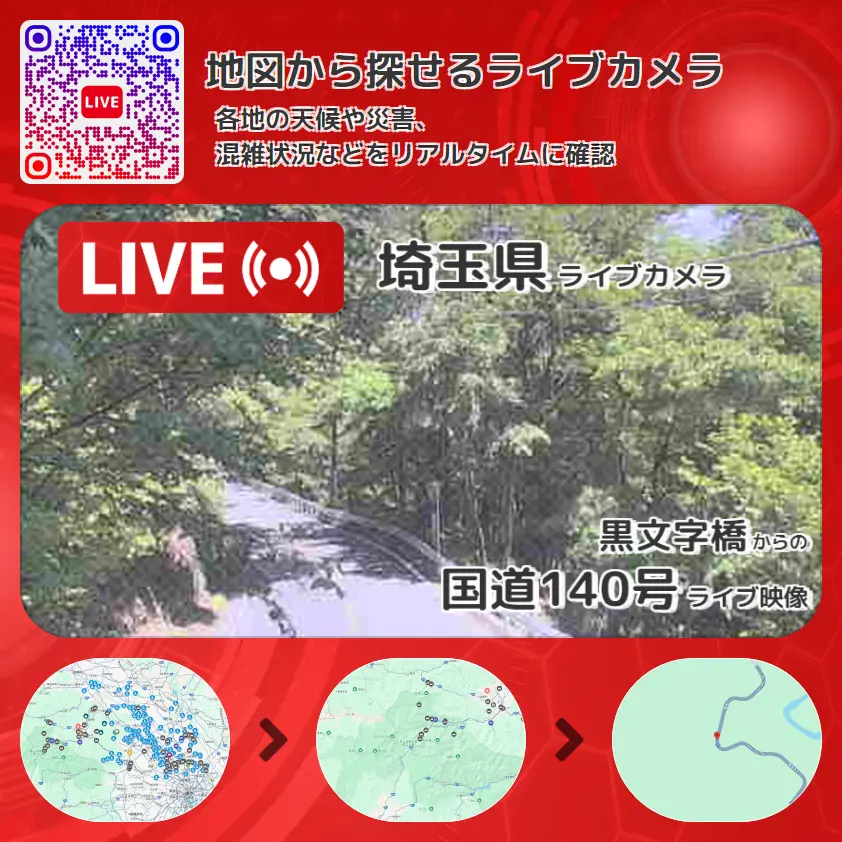 国道140号(秩父往還・彩甲斐街道)の他に、雁坂峠や周辺の気象状況も併せてチェックすることが可能で、台風・大雨・地震などの災害による被害状況も把握することができます。