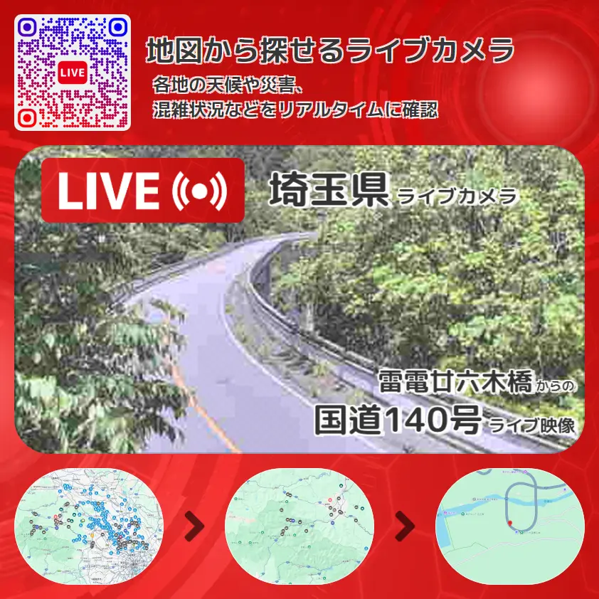 国道140号(秩父往還・彩甲斐街道)の他に、大滝大橋や周辺の気象状況も併せてチェックすることが可能で、台風・大雨・地震などの災害による被害状況も把握することができます。