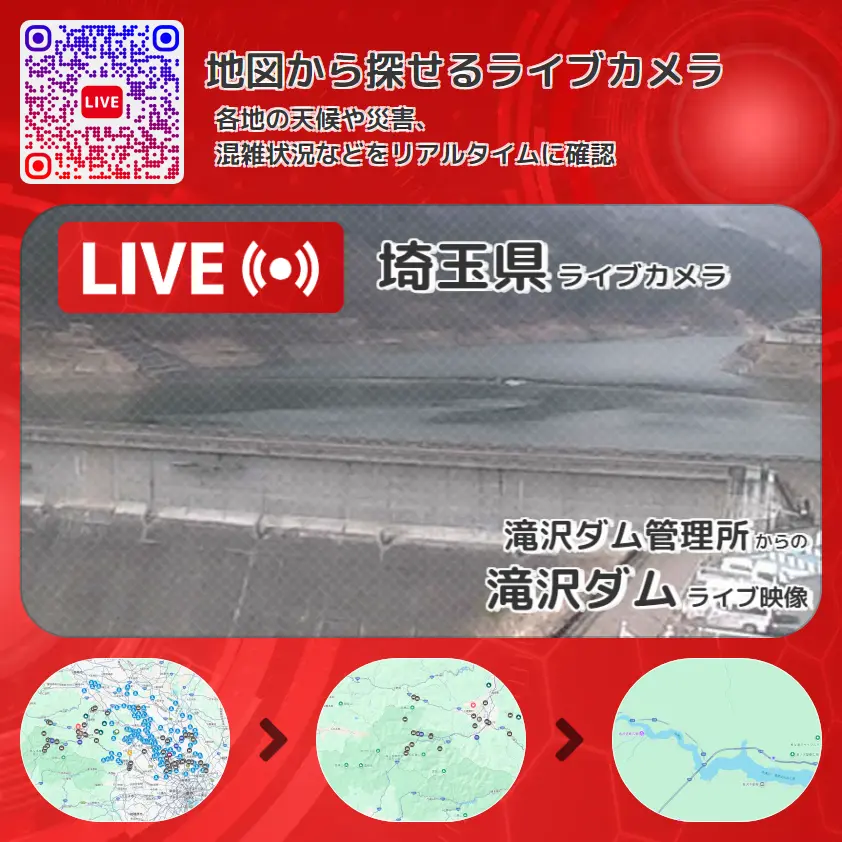 周辺の気象状況も併せてチェックすることが可能で、台風・大雨・地震などの災害による被害状況も把握することができます。