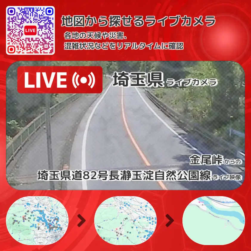 埼玉県道82号長瀞玉淀自然公園線(白鳥通り)の他に、荒川や周辺の気象状況も併せてチェックすることが可能で、台風・大雨・地震などの災害による被害状況も把握することができます。