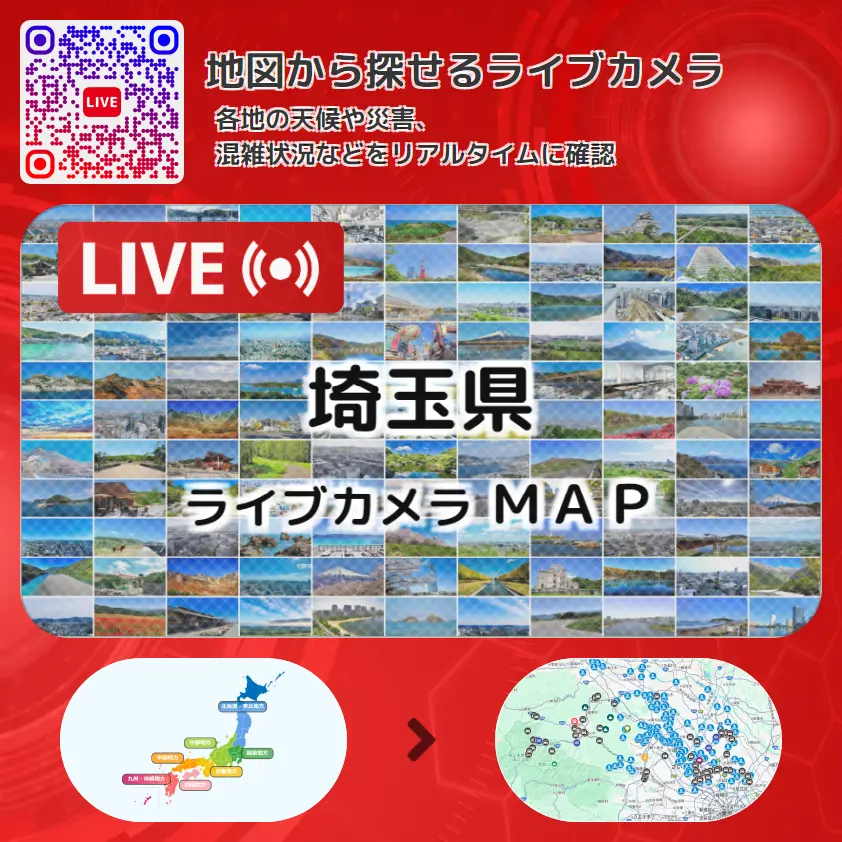 埼玉県のライブカメラMAP 埼玉県 X Facebook はてブ LINE コピー 2025.11.082025.11.09 リンク GoogleMapの地点一覧は測地系の影響により、地図上のマークが示す地点はおおよその場所になります。正確な位置は各地点の詳細ページをご確認ください。リンク