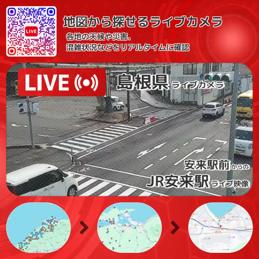 JR安来駅(山陰本線)の他に、安来駅前交差点や周辺の気象状況も併せてチェックすることが可能で、台風・大雨・地震などの災害による被害状況も把握することができます。
